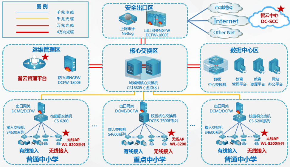 皇御环球官网 根据普教用户无线网络管理和使用现状,以及对业务应用系统分析,遵从“云网融合 易网无忧”的新主张,对原有有线城域网采用了“云 ‧ 平台”二级智云部署架构,搭建了简单易用的综合智云管理平台,部署了无线网络。既实现了“人 ‧ 网络”的深度管理融合,也为云业务的召开打下良好的基础!总拓扑结构图如下: